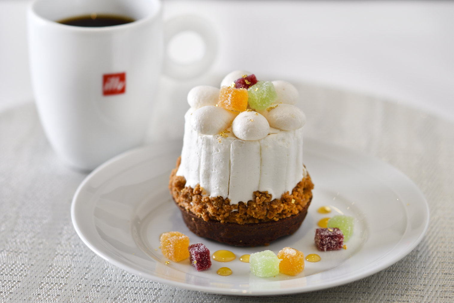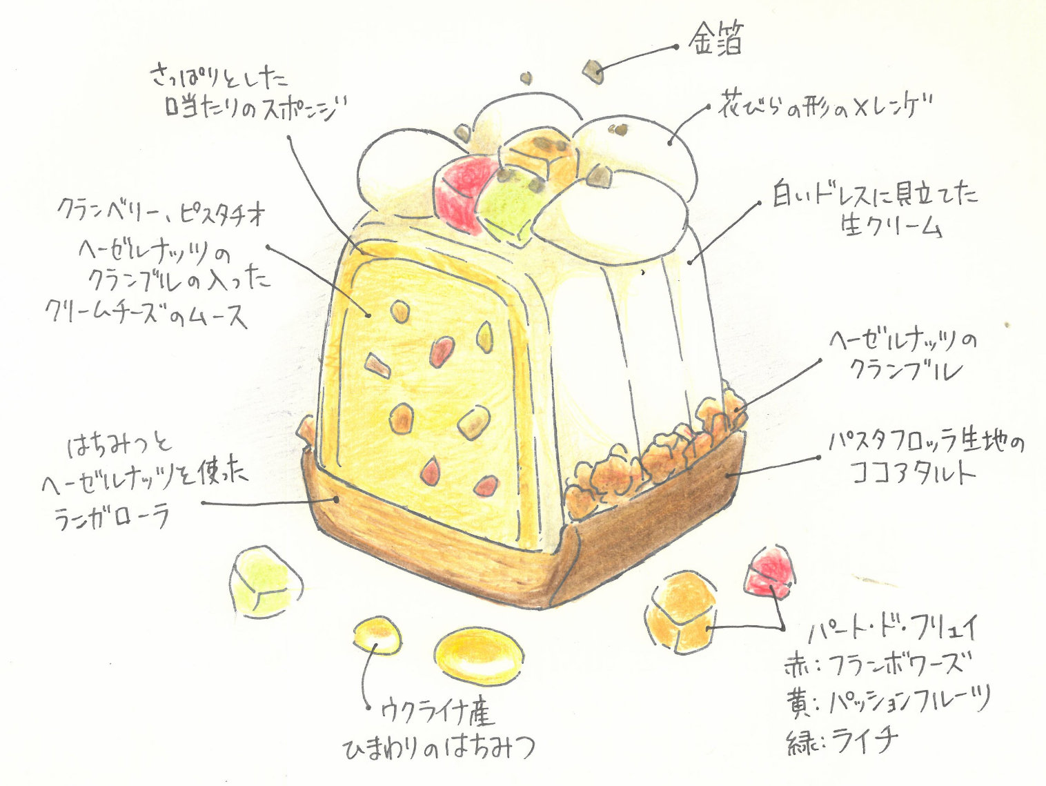 純白のウエディングドレスを思わせるタルトのトップを彩るのは、誕生石カラーのパート・ド・フリュイ。仕上げには広島・歴清社の高純度金箔をひとふり。こだわりの素材が織りなすハーモニーに、春のきらめきを感じる一品です。